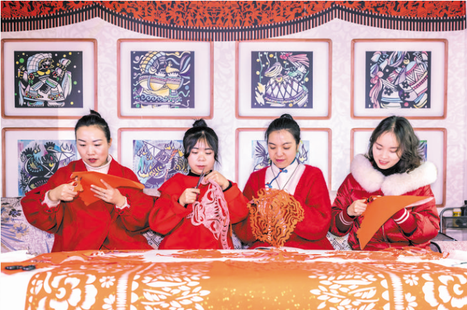 1月17日,岳紅霞(右二)帶領工作室學員創(chuàng)作“金牛送?!奔艏?。近日,曾獲全國剪紙大賽“金剪刀獎”、貴州省畢節(jié)市黔西縣非遺傳承人岳紅霞帶領工作室學員創(chuàng)作“金牛送?!毕盗兄黝}作品,迎接農歷牛年。 (新華社發(fā) 范暉 攝)