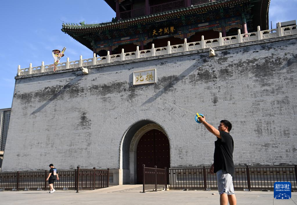 在天津市鼓樓附近,魏博文在放飛一架制作完成的風箏(6月8日攝)。