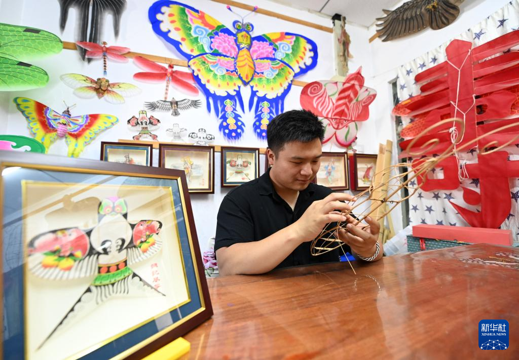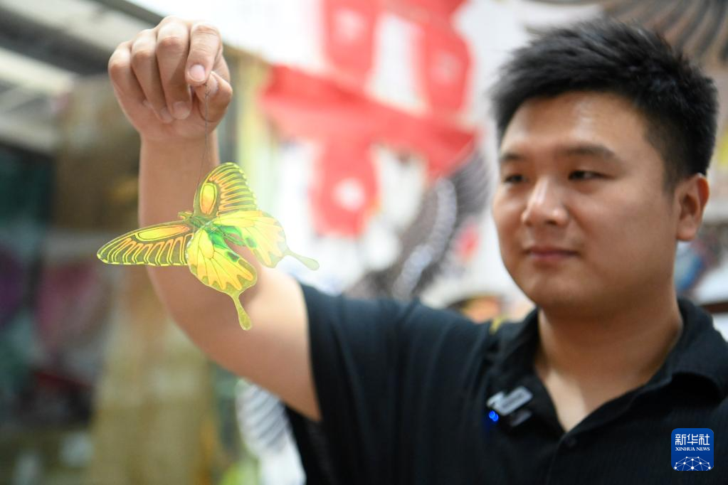 出身風箏世家的魏博文大學畢業(yè)后,回到家鄉(xiāng)跟隨父親魏國秋“入行”做風箏。他從自己有所基礎的繪畫著手,發(fā)揮年輕人的創(chuàng)新優(yōu)勢,在風箏設計上屢屢出新,不僅與一些游戲公司合作推出風箏聯(lián)名款,還推動風箏制作技藝的改進創(chuàng)新,設計了適合在室內(nèi)放飛的迷你風箏。