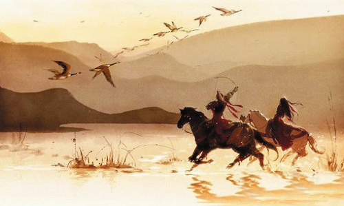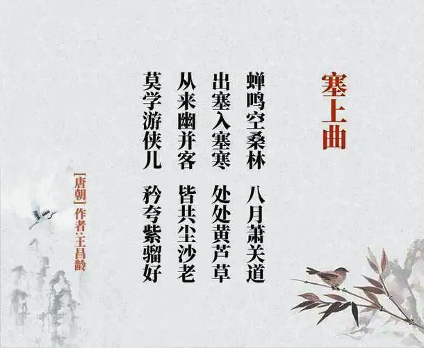 《塞上曲》唐(王昌齡):“蟬鳴空桑林,八月蕭關(guān)道。出塞入塞寒,處處黃蘆草。從來幽并客,皆共塵沙老。莫學(xué)游俠兒,矜夸紫騮好?!痹娭械娜?、塞下,說穿了就是關(guān)外和關(guān)內(nèi)。但,其實(shí)景象沒什么特別,黃云、風(fēng)沙、駿馬、朔雪、美酒、桑林、關(guān)道、蘆草、沙場(chǎng),也似乎只有這些才能更符合邊塞詩人的審美。而“雁門關(guān)”成了李頎、王昌齡這對(duì)好友的共同命題。