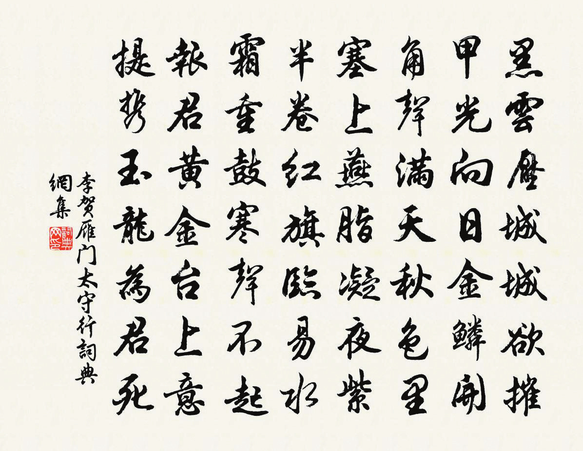 從詩仙手中接過筆的是“詩鬼”。李賀豪情萬丈,大筆一揮,筆走龍蛇,一幅巨作石破天驚,橫空出世。之所以說是一幅巨作,是因?yàn)槔钯R筆下的這首詩的確太像一幅畫了:“黑云壓城城欲摧,甲光向日金鱗開。角聲滿天秋色里,塞上燕脂凝夜紫。半卷紅旗臨易水,霜重鼓寒聲不起。報(bào)君黃金臺(tái)上意,提攜玉龍為君死?!?/p>