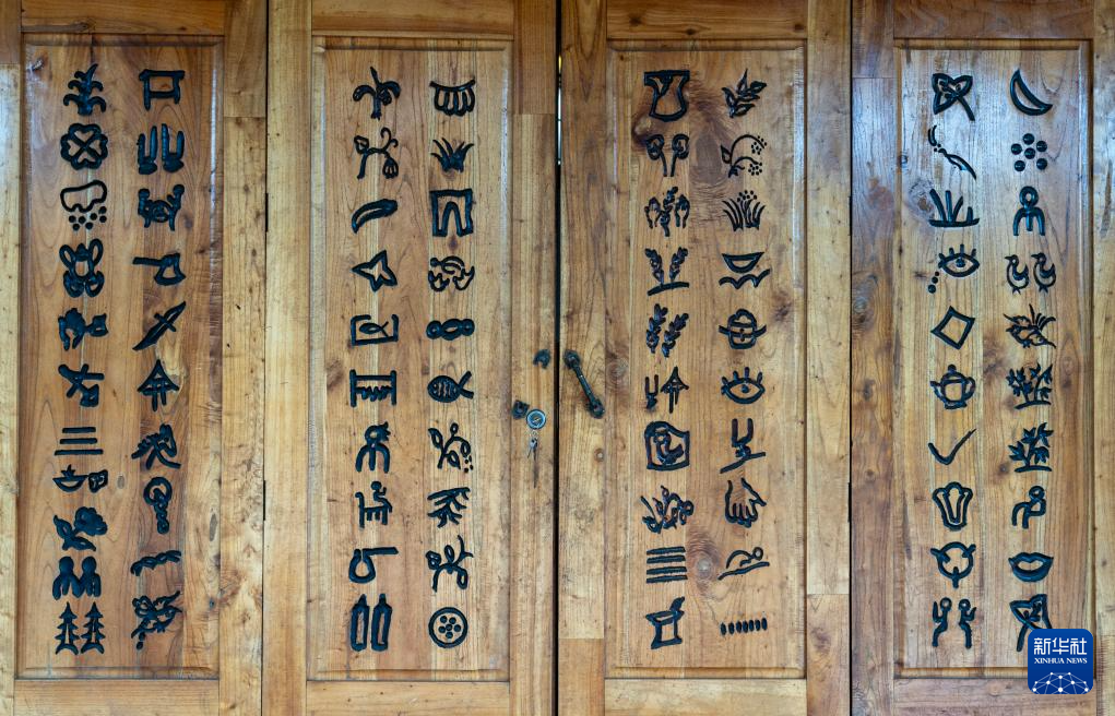這是7月30日拍攝的刻在坡芽村坡芽傳習(xí)館門板上的81個(gè)“坡芽情歌”圖畫符號(hào)。