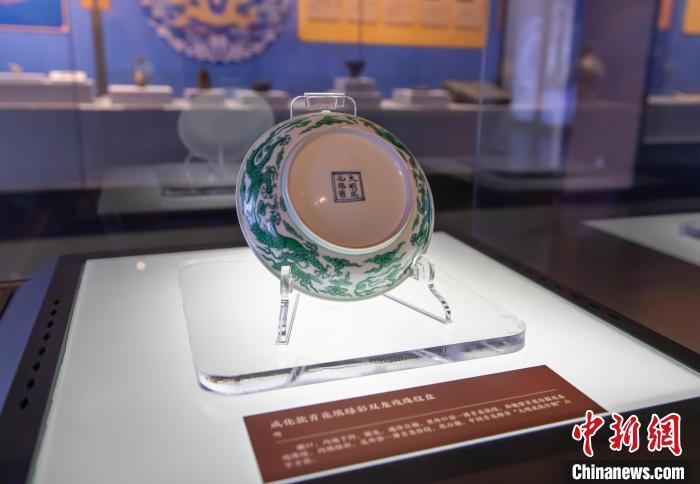 圖為展品國家一級文物成化款青花填綠彩雙龍戲珠紋盤(明)。王在御 攝