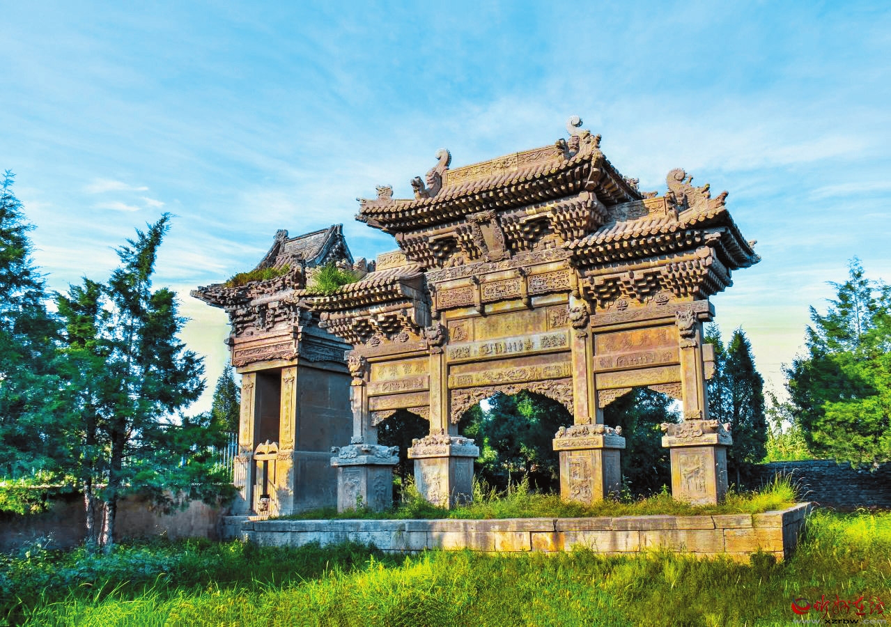 坐落于村中的朱氏牌樓是晚清中儀大夫、陜西延榆綏兵道加鹽運使武訪疇為其母所修的節(jié)孝牌坊。它不僅見證了朱氏家族的輝煌歷史,也反映了當(dāng)時社會的文化風(fēng)貌,承載著豐富的歷史文化內(nèi)涵,為第八批全國重點文物保護單位。牌樓有主坊和配坊兩座,主坊矗立在村內(nèi)南街,面寬三間,四柱三樓,重檐歇山頂,高近11米、寬15米。欄板內(nèi)剔底雕刻成一幅幅人物故事圖案,霸王柱間鏤雕丹鳳朝陽。匾形走馬板上書“柏舟矢志”“竹柏流芳”各四字。牌坊下檐明間置匾一塊,書“圣旨”二字,兩次間匾書分別為“懿范”“徽音”。配坊在村南,高8米有余,四柱三門,單檐歇山頂,規(guī)模略小,造型風(fēng)格與主坊一樣,皆為石雕藝術(shù)精品。