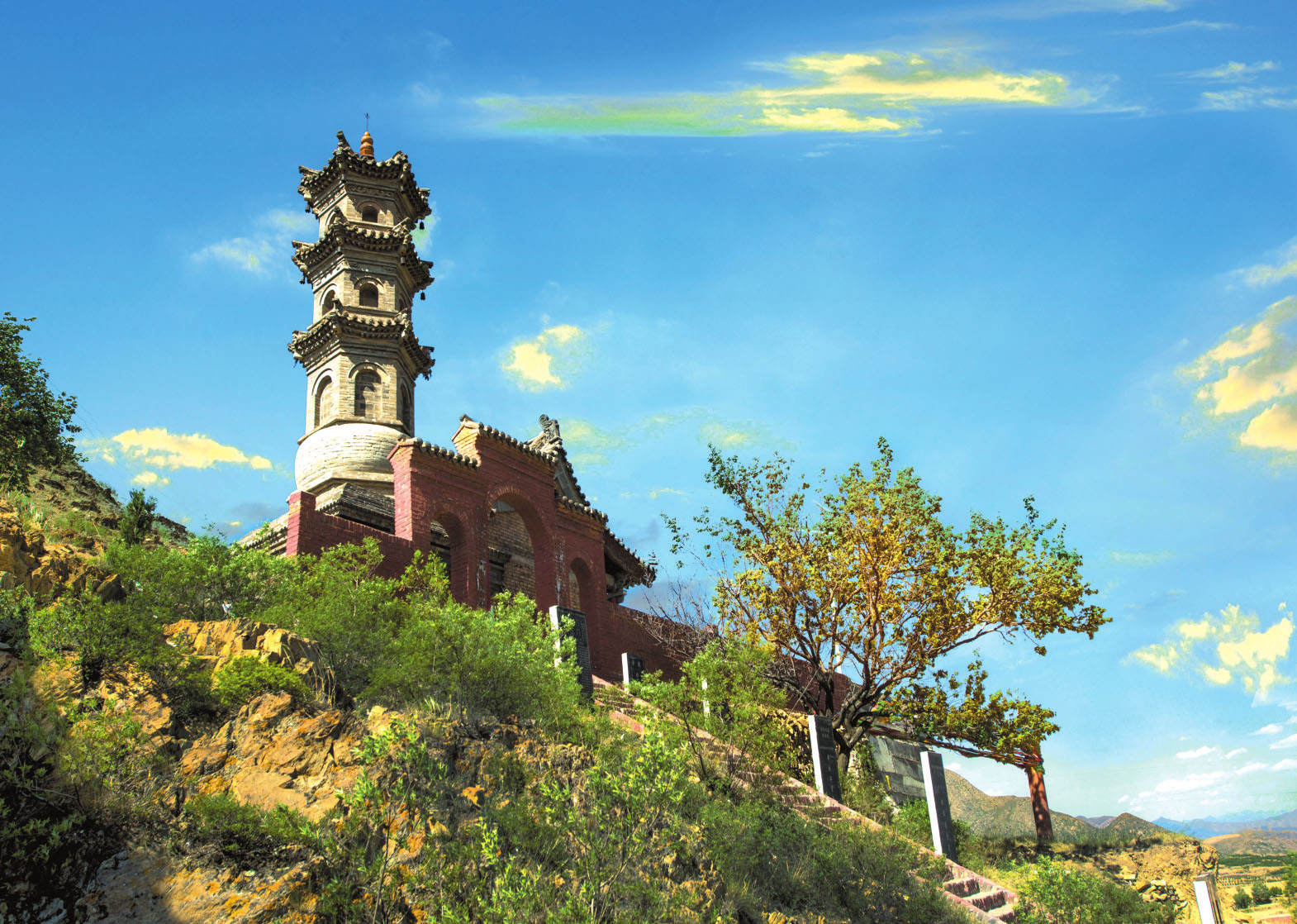 同河流域中部,還有一座獨特的小山,名叫“福壽山”,其形酷似倒扣的大碗。山南有一泓玉泉水,清澈可鑒,為同河最大支流。李居禎與福壽山還有一段神話故事。李居禎戎馬一生,身經(jīng)百戰(zhàn),雖至老年,每日仍要騎馬射箭。一日,他乘坐一匹大紅馬,信馬由韁,來到福壽山下,山腳下有一溫泉,名叫玉泉,滾滾而出,于是,他在福壽山頂修建起寺廟,山上寺廟以泉命名,叫玉泉寺。乾隆版《崞縣志》載:“玉泉寺:面沱水,背龍潛,左同溪,右回光,映帶朝拱,宛然勝概”。