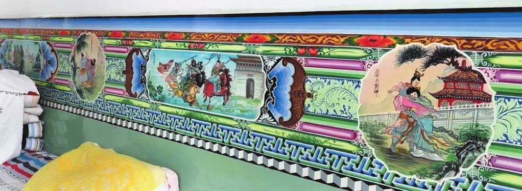 炕圍畫也叫墻圍畫,距今已有1200多年歷史,是原平人特有的“根脈性”藝術(shù)。手工藝人以墻為紙,將民族文化與當(dāng)?shù)厣睢⒕袂擅钊诤?,造型藝術(shù)集壁畫、年畫和建筑彩繪于一體,定格于墻壁之上,代代相傳。“17歲起,我就跟隨父親學(xué)習(xí)炕圍畫技藝,如今有60多年了。”弓進(jìn)壽感慨道,“以前家家戶戶都會在炕邊畫炕圍畫。隨著時代變遷,人們住進(jìn)了樓房,我們就把炕圍畫畫在紙上。”