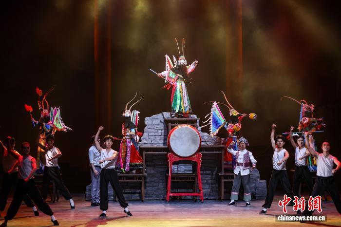 由貴州省民族歌舞團(tuán)演出的民族歌舞劇《山河同心》作為開幕式劇目首演。劇目以第一批國家級非物質(zhì)文化遺產(chǎn)名錄項(xiàng)目“安順地戲”為重要情感紐帶和文化符號,共分為《上梁》《拜月》《敬茶》《出征》四場。
