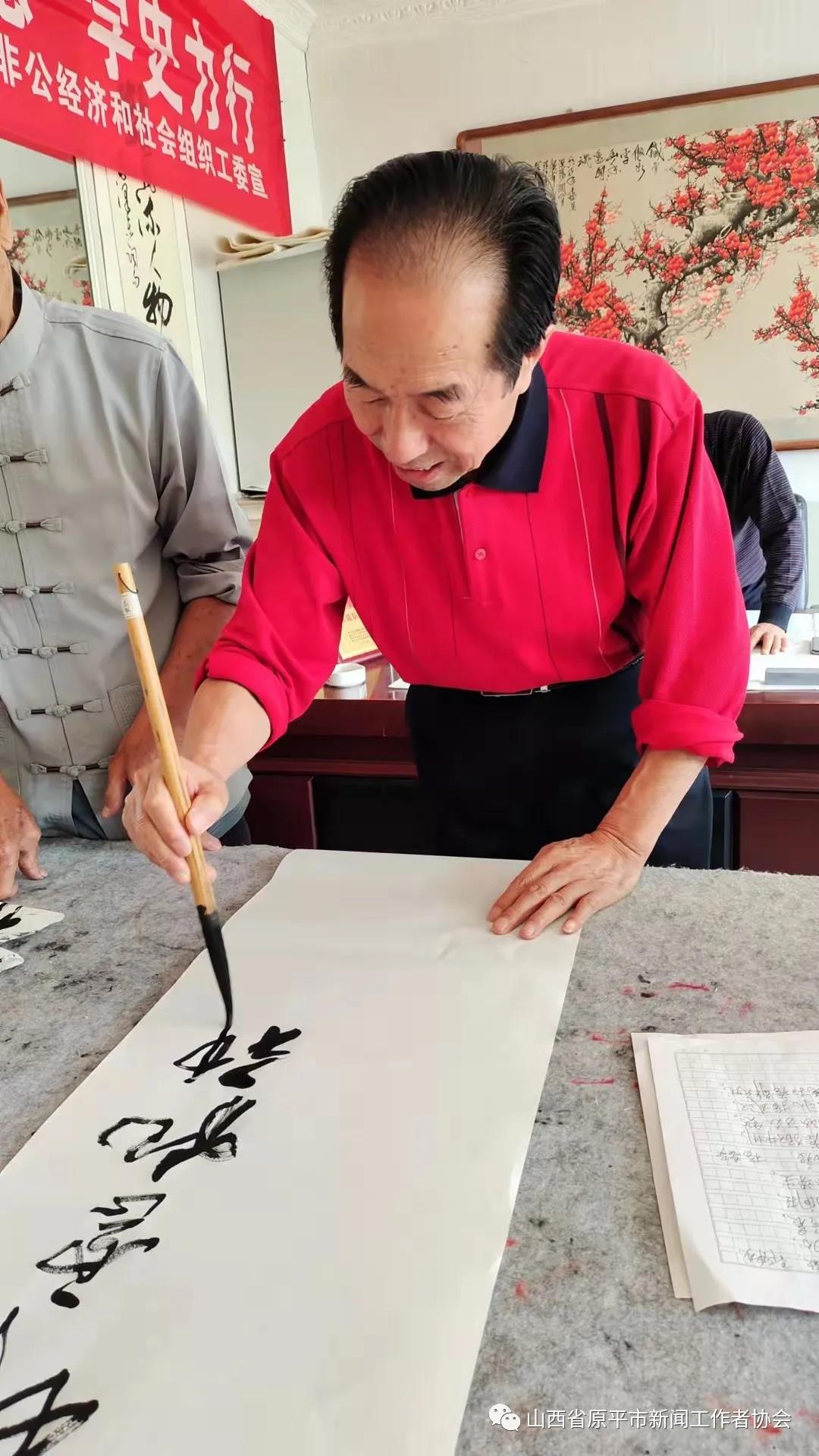 活動(dòng)現(xiàn)場(chǎng),大家暢所欲言,紛紛聯(lián)系思想實(shí)際,交流了學(xué)習(xí)黨史、明理知進(jìn)的心得體會(huì),圍繞學(xué)史長(zhǎng)知、學(xué)史明理、學(xué)史增信、學(xué)史興業(yè)進(jìn)行了熱烈討論。接著,書畫藝術(shù)組的書法家亢銀中、趙存仁、王玉伍、張正山、王福歲、王弘新,及學(xué)會(huì)顧問書畫名家溫樹森老師、以及特邀書畫名家李晉復(fù)先生,紛紛揮毫潑墨,書寫出學(xué)習(xí)黨史的感悟與名言。大筆揮灑中,一幅幅寫有“賡續(xù)精神血脈、傳承紅色基因”“明理增信.崇德力行”“不忘初心、牢記使命”和“江山就是人民、人民就是江山”等字樣的真、草、隸、篆、行書藝作品,從筆下飄然而出。墨香中呈現(xiàn)出各有千秋、韻味感人的風(fēng)格,博得觀賞者們的點(diǎn)贊稱道,并爭(zhēng)相拿到一幅贈(zèng)品。書法家們顧不上喝水,整整忙了一個(gè)上午。特別是書畫藝術(shù)組組長(zhǎng)李文光,由于平時(shí)在廣州忙于接送孩子上學(xué),放暑假回原平后特地趕來,高興地跟大家一起切磋書藝、展示才藝。書法家們還探討了書法藝術(shù)融入社會(huì)、融入黨性、服務(wù)大眾、服務(wù)中心的蹊徑、舉措與打算。(賈宣生 王福歲)