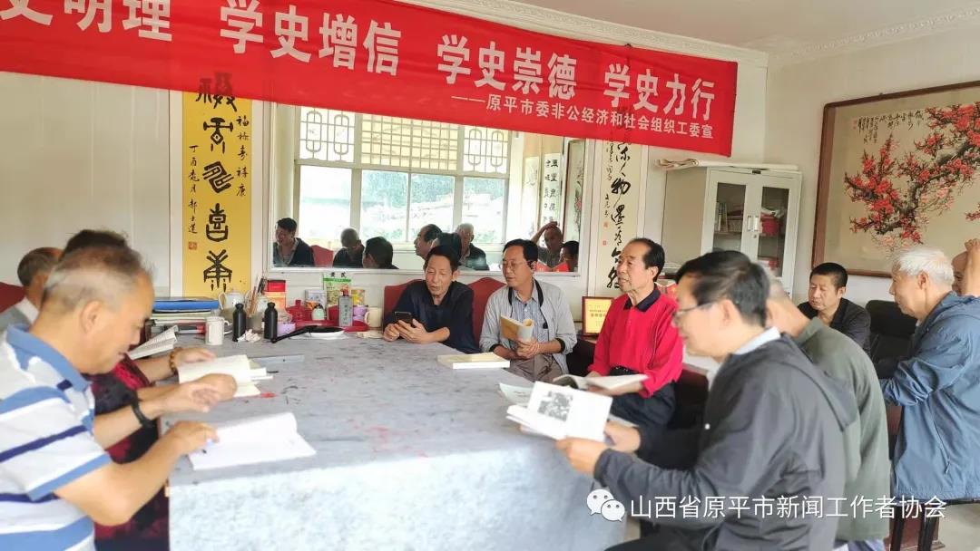 近日,原平市老年新聞文化學(xué)會(huì)組織開展了一次以學(xué)黨史悟思想為主旨的專題筆會(huì)活動(dòng)。學(xué)會(huì)會(huì)長(zhǎng)楊愛英、學(xué)會(huì)黨支部書記劉興良跟學(xué)會(huì)書畫藝術(shù)組成員一起,在這秋高氣爽、陽光燦爛的日子里,以滿腔熱情來到學(xué)會(huì)辦公中心柳巷牡丹園,參加了這一集研討和書法于一體的別開生面的活動(dòng)。學(xué)會(huì)文化合作單位增壽口腔、金色童年、萬源石雕與奶爸奶媽等單位人員,以及部分書畫愛好者共近50人,共同分享了書藝交流的喜悅。