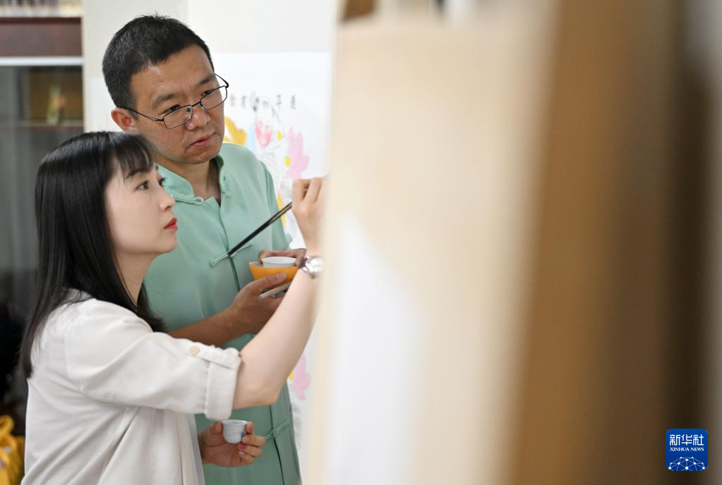 在天津市西青區(qū)的楊柳青霍氏古一張畫店,霍樹林(右)和妻子王丹一起進行彩繪(6月6日攝)。