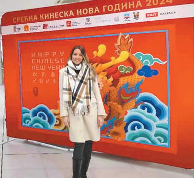 1月30日,在塞爾維亞諾維薩德,一位女士在“歡樂春節(jié)”活動展板前留影。本報記者 謝亞宏攝