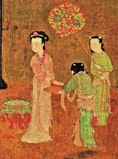 宋代女性服飾重神韻。宋代女性清秀也好,婉約也罷,臉部神態(tài)往往離不開(kāi)妝容。于眉目之間,便有“都緣自有離恨,故畫(huà)作遠(yuǎn)山長(zhǎng)”“倒暈工夫,畫(huà)得宮眉巧”;于臉頰之間,便有“嫩臉修蛾,淡勻輕掃”“淺拂胭脂輕傅粉”之淡妝,亦有“近來(lái)因甚要濃妝,不管滿(mǎn)城桃杏妒”之濃妝;而于神情之間,便有“和羞走,倚門(mén)回首,卻把青梅嗅”“畫(huà)愁眉,遮語(yǔ)回輕扇,含羞下繡幃”。從妝容到神態(tài),刻畫(huà)了宋代女性神韻一隅。(徐雅琴)