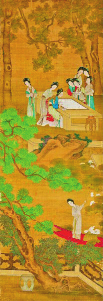 宋代畫(huà)作亦呈現(xiàn)女性服飾之濃郁色韻。畫(huà)作《女孝經(jīng)》中的女性穿著,有淡綠衫配淡紫裙、白衫配淡綠壓花裙、淡藍(lán)衫配淡黃裙等,披帛外搭相應(yīng)為淡藍(lán)、淡紫和淡黃,女性服色呈現(xiàn)出素淡搭配之主流?!冬幣_(tái)步月圖》為宋代畫(huà)家劉宗古創(chuàng)作,畫(huà)中女子裙子均為白色,衣著素淡簡(jiǎn)樸,氣質(zhì)高雅脫俗?!额率钟^(guān)花圖》中服色搭配更為柔和,女主人上穿淡紫窄袖長(zhǎng)襦,下穿白色長(zhǎng)裙,外搭淡黃披帛;侍女穿淡綠袍衫搭淡黃腰間寬巾,亦有穿淡藍(lán)袍衫搭白色腰圍?!肚迕魃虾訄D》為中國(guó)古代著名繪畫(huà),由畫(huà)家張擇端創(chuàng)作,畫(huà)中少有女性,普通勞動(dòng)?jì)D女多穿青色裙或腰系青花圍巾,有身份的女子戴蓋頭、穿紫色褙子,展現(xiàn)出簡(jiǎn)約、素雅的宋代服飾風(fēng)格。
