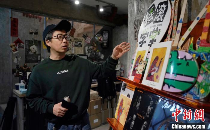 “戰(zhàn)馬時(shí)代”創(chuàng)始人、資深樂評(píng)人劉釗正在展示為維吾爾族歌唱家塞努拜爾制作的演出周邊紀(jì)念品。景詩雁 攝