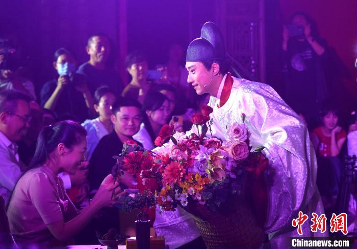 圖為“宋詞里的福建”沉浸式戲劇演出現(xiàn)場的演員與觀眾互動。 中新網(wǎng)記者 呂明 攝