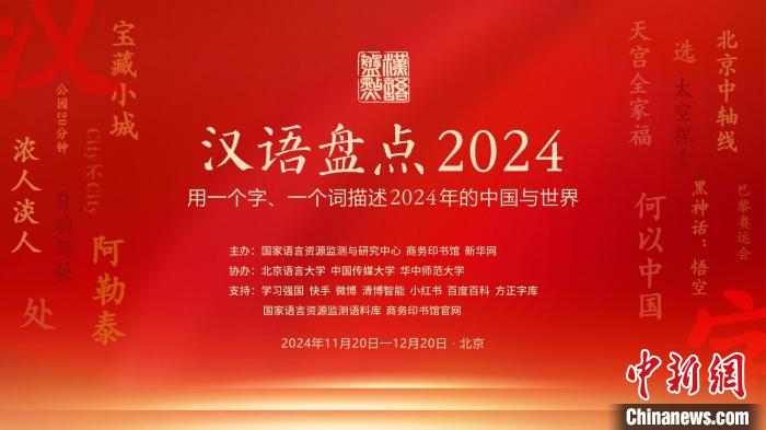 由國家語言資源監(jiān)測與研究中心、商務印書館等聯(lián)合主辦的“漢語盤點2024”20日在京啟動,“用一個字、一個詞描述當年的中國與世界”,鼓勵全民用語言記錄生活,描述中國視野下的社會變遷和世界萬象。