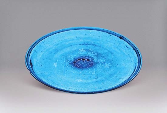 據(jù)地宮出土的物賬碑記載,整個(gè)地宮被布置得“窮天上之莊嚴(yán),極人間之煥麗”。在這些文物中,有六件來(lái)自阿拉伯國(guó)家的刻紋藍(lán)玻璃盤。玻璃盤保存完好,為無(wú)模吹制成形,通體藍(lán)色,晶瑩光潔,盤面刻滿紋飾,主體紋飾為以雙線勾勒出的十字形框架,盤心為正方形方框,方框外刻四個(gè)拱門形狀的尖瓣,與中心方框組成四個(gè)“米哈拉布”紋樣。“米哈拉布”是伊斯蘭教清真寺大殿的禮拜龕,四個(gè)尖瓣內(nèi)各刻一朵五瓣葉子植物紋,尖瓣之間也飾以植物紋。制作工藝是在玻璃成器之后,用比玻璃更堅(jiān)硬的工具在其表面淺刻花紋,加以描金,從而使得玻璃盤更為華麗。