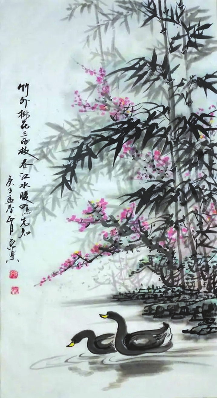 數(shù)字點(diǎn)染,精妙難言。古詩中常用數(shù)字實(shí)寫事物,前呼后應(yīng)形成點(diǎn)染。蘇軾《惠崇春江晚景》中寫“竹外桃花三兩枝,春江水暖鴨先知”,先以“三兩枝”具體描寫桃花零星開放的實(shí)景,渲染初春的環(huán)境氣氛,再以“春江水暖鴨先知”點(diǎn)明題旨。“三兩枝”不多不少恰到好處,點(diǎn)出初春的景物特征——少則春寒料峭,過于冷寂,多則春意盎然,稍嫌熱鬧,都無法與后文“春江水暖鴨先知”對(duì)季候變化的感悟相呼應(yīng)。葉紹翁的《游園不值》云“春色滿園關(guān)不住,一枝紅杏出墻來”,先點(diǎn)出“春色滿園”的主旨,再以“一枝紅杏”具體渲染春天壓抑不住的蓬勃生機(jī),以及作者游園不成忽見“春色”破墻溢出的驚喜。這個(gè)“一”是其余數(shù)字替代不了的,數(shù)字點(diǎn)染,準(zhǔn)確精當(dāng),妙不可言。