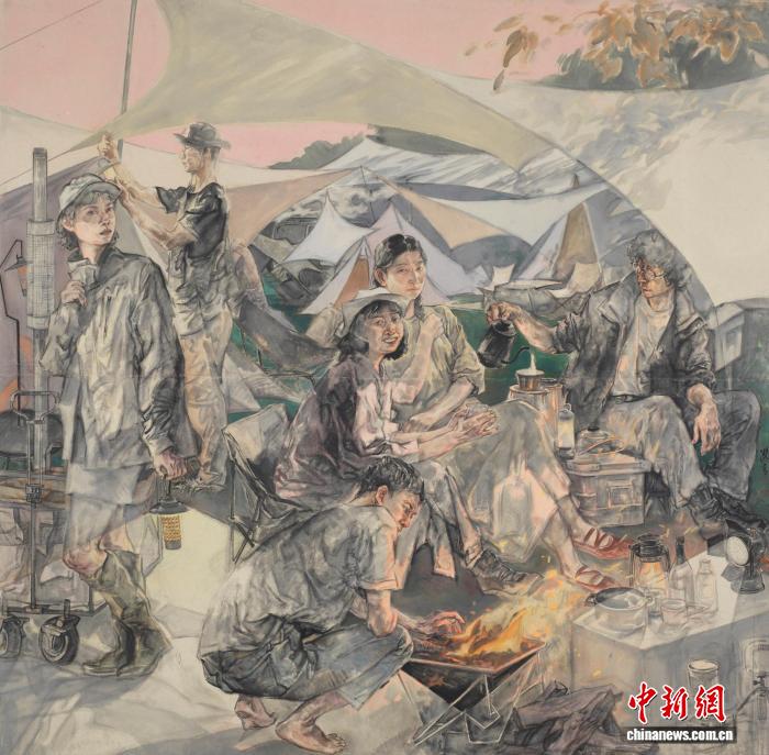 以畫家藺潔青的中國畫《清風徐來》為例,其是浙江省第十五屆美術作品展金獎作品,以傳統(tǒng)人物畫技法表現(xiàn)當代青年郊野露營場景,通過描繪清風拂過林間被永恒定格的瞬間,傳遞都市人向往自然、追求心靈自由的當代精神,展現(xiàn)出中國傳統(tǒng)繪畫語言在表現(xiàn)現(xiàn)實題材上的蓬勃生命力。