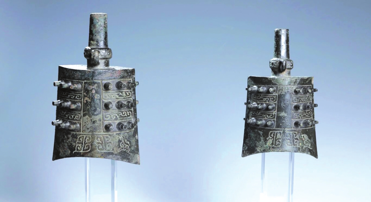 在形制上,編鐘有兩種——甬鐘和鈕鐘,最上面的平面立有“甬柱”的為甬鐘,立有“懸鈕”的則是鈕鐘。在我國(guó)已發(fā)現(xiàn)的甬鐘中,具有代表性的是晉侯蘇鐘,鑄造于西周,形制精確,音律精準(zhǔn)。鈕鐘西周晚期較多,三門(mén)峽出土的虢仲鈕鐘是目前已知最早的鈕鐘。《孟子》中記載了一個(gè)關(guān)于鈕鐘的故事,孟子和學(xué)生高子親眼看到過(guò)一個(gè)夏禹時(shí)的鈕鐘,高子看到懸鈕像蟲(chóng)蛀過(guò)一樣快斷了,猜測(cè)這是因?yàn)榇绥娐曇艉?、用得多?/p>
