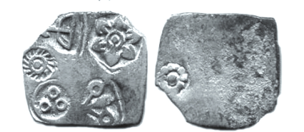 古印度摩揭陀國孔雀王朝時期的卡夏帕那銀幣,似乎可以為亞里士多德的說法提供佐證。卡夏帕那銀幣的具體起源時間不詳,其名源自重量單位“卡夏”,形制為切割成型的銀片或銀塊,正面加蓋戳記作為價值標識,戳記數(shù)量通常為一個至六個不等。早期的卡夏帕那銀幣可能由民間或地方勢力發(fā)行,其價值除了依托銀材本身的重量與成色,很大程度上取決于加蓋戳記的發(fā)行人或認證人的信譽背書。