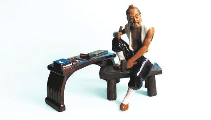 塑像高22厘米、長14厘米、寬13厘米,魯班右手持鑿、左手緊握鐵錘,雙目炯炯,仿佛正凝神思索,即將開啟一場巧奪天工的創(chuàng)作;身旁的工作臺長19.7厘米、寬6.5厘米、高10厘米,上面整齊擺放著曲尺、錘子、鑿子等工具。作品靈感源自春秋時期這位傳奇工匠的故事,以陶塑藝術為載體,栩栩如生地呈現(xiàn)出魯班的形象,讓歷史底蘊與藝術魅力交融出獨特的韻味。