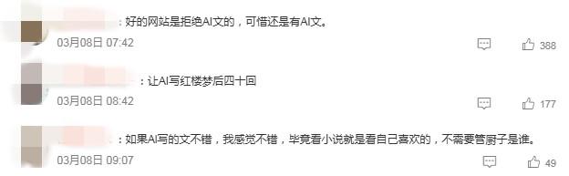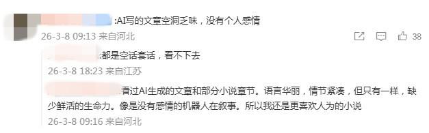 有報(bào)道稱,社交媒體上的AI寫作暴富噱頭,讓網(wǎng)文圈變了天。有網(wǎng)文作家坦言,自己日更近萬(wàn)字已是極限,但在AI幾分鐘幾萬(wàn)字面前,直接被降維打擊。評(píng)論區(qū)里,網(wǎng)友議論紛紛,“AI寫的文章空洞乏味,沒有個(gè)人感情”“有一本AI文火的嗎”……