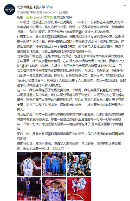 人民網(wǎng)北京9月15日電(楊喬棟)15日,林書豪通過個(gè)人社交平臺(tái)發(fā)布自制視頻宣布,下個(gè)賽季將不再代表北京首鋼男籃征戰(zhàn)CBA賽場(chǎng),而將繼續(xù)尋求征戰(zhàn)美國職業(yè)籃球聯(lián)賽的機(jī)會(huì)。林書豪在視頻中稱,最近四周都在思考下一步的規(guī)劃,但是最終還是忍痛做了一個(gè)艱難的決定——暫時(shí)告別CBA,“我決定今年(下個(gè)賽季)不回首鋼去打球,這個(gè)決定是我人生最難的一個(gè)決定?!彪S后,北京首鋼男籃通過官方微博發(fā)布長(zhǎng)文,在確認(rèn)林書豪“離開”的同時(shí)也第一時(shí)間為其送上祝福。北京男籃官宣全文如下:
