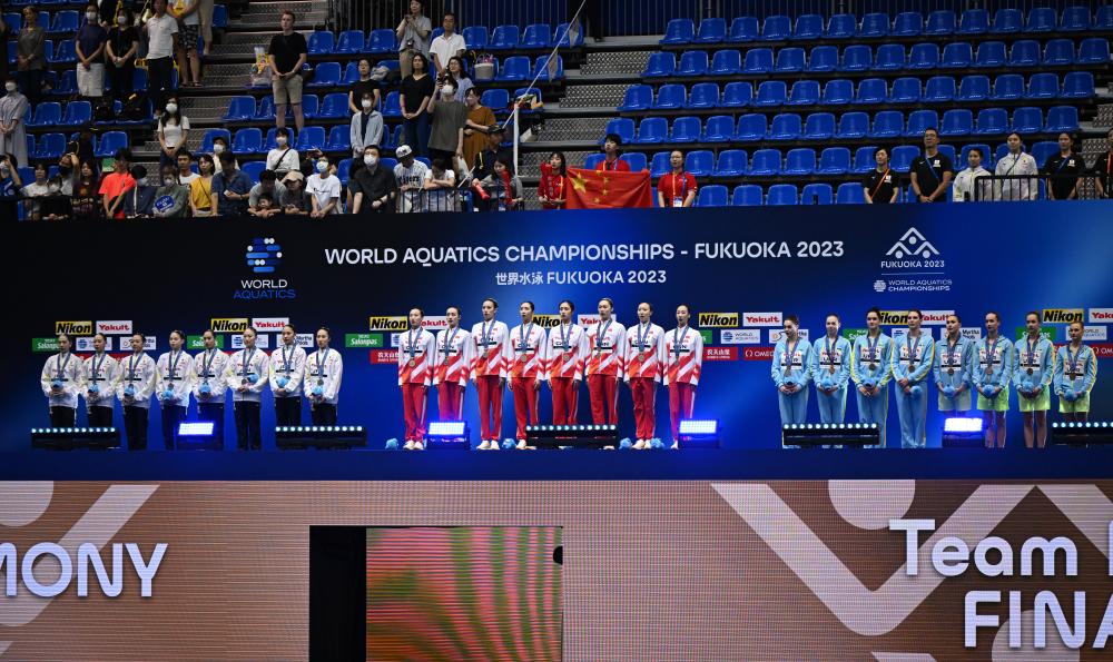7月21日,在日本福岡舉行的2023年世界游泳錦標賽花樣游泳集體自由自選決賽中,中國隊以329.1687分的成績獲得冠軍。新華社記者 夏一方 攝