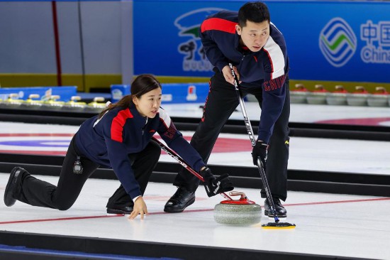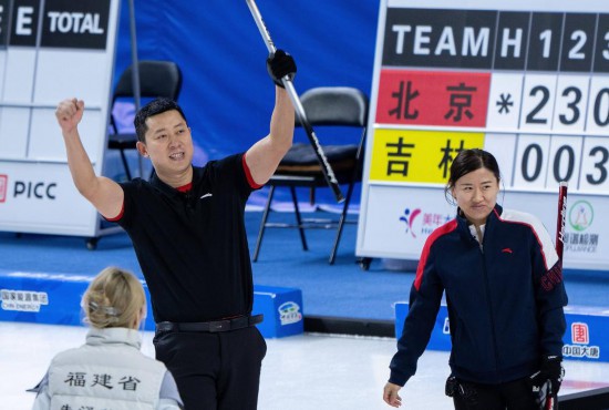 20日,在第十四屆全國冬季運(yùn)動會冰壺(公開組)混雙決賽中,黑龍江隊以7:6險勝福建隊,奪得金牌。