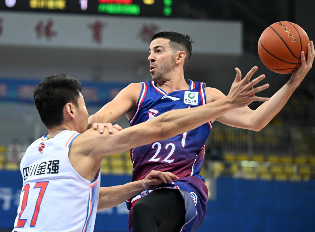 3月10日,天津隊(duì)球員羅切斯特(右)在比賽中傳球。新華社記者 趙子碩 攝