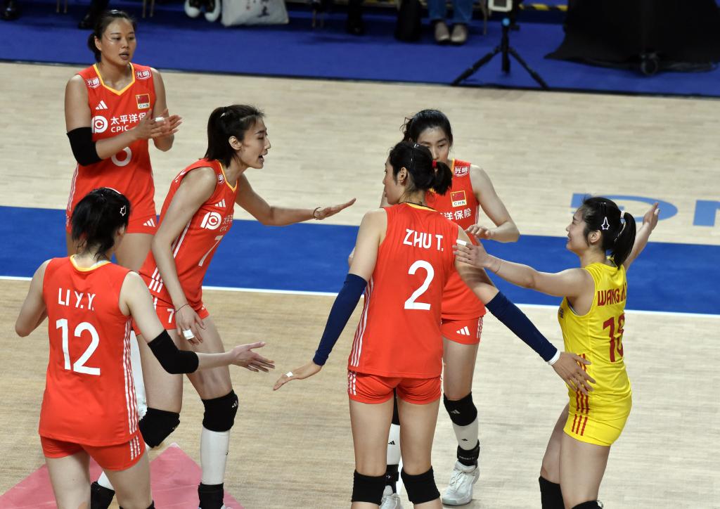 6月11日,中國隊(duì)球員朱婷(中上)在比賽中進(jìn)攻。新華社記者 朱煒 攝