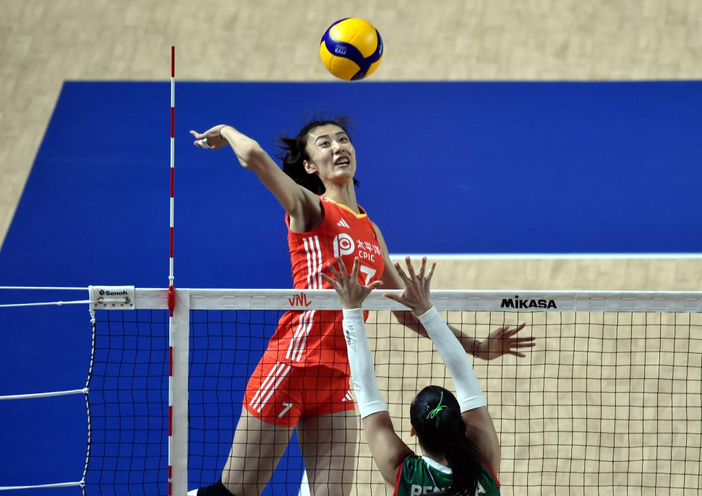 6月11日,中國隊(duì)球員王媛媛在比賽中扣球。新華社記者 盧炳輝 攝