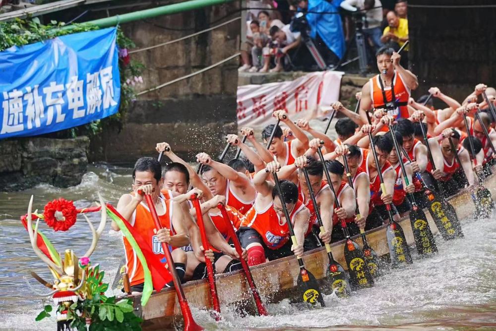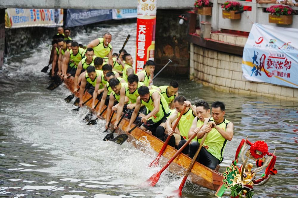 在寬度僅有3至6米的S形水道,一條長25米的龍舟滿載40余人,“絲滑”地漂移過彎。雖然滿頭大汗,被人群擠得喘不過氣,但觀者無不大呼過癮。