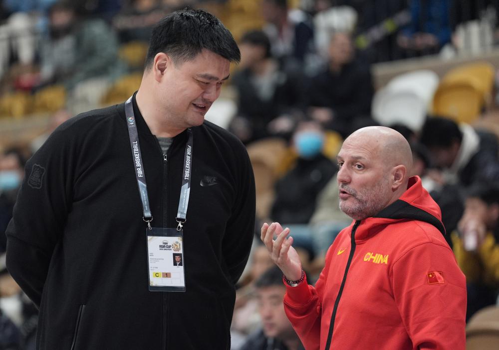 圖為2024年2月22日,在國際籃聯(lián)2025男籃亞洲杯預(yù)選賽賽前,時任中國隊主教練喬爾杰維奇(右)與中國籃協(xié)主席姚明交流。新華社記者 孟永民 攝