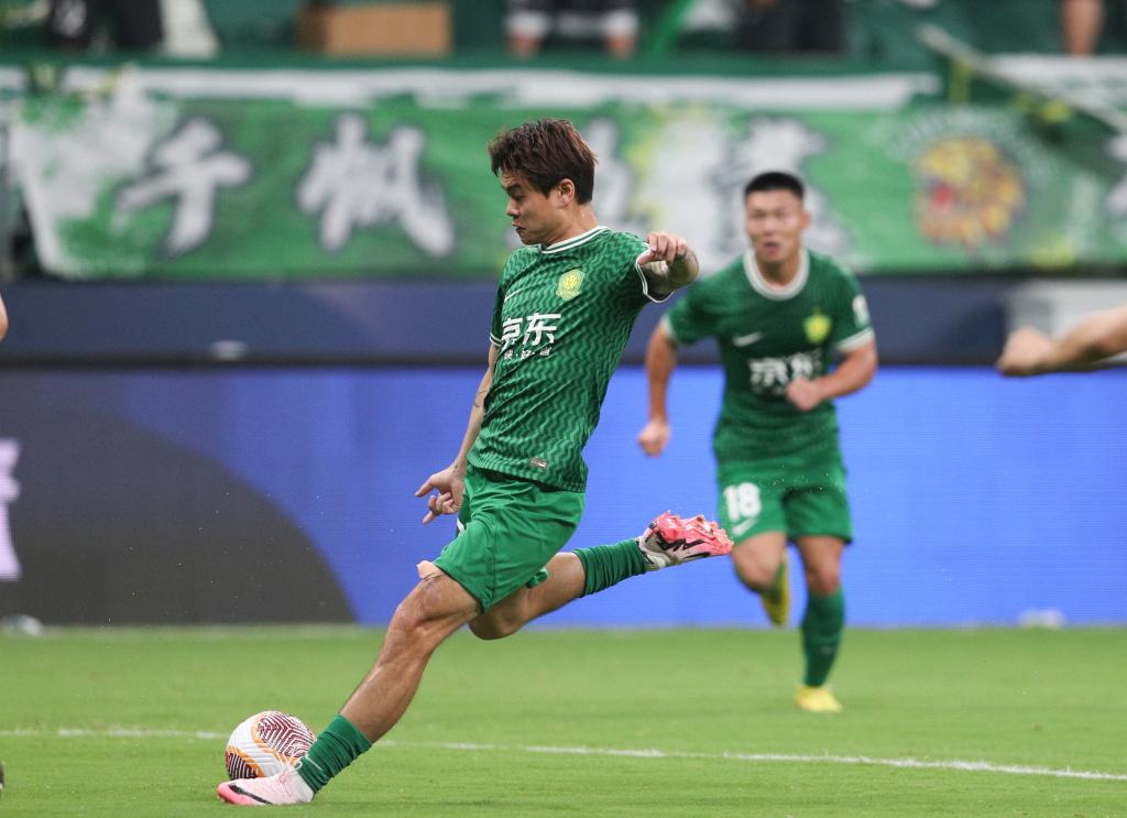 6月26日,北京國安隊(duì)球員楊立瑜射門得分。新華社記者 許雅楠 攝