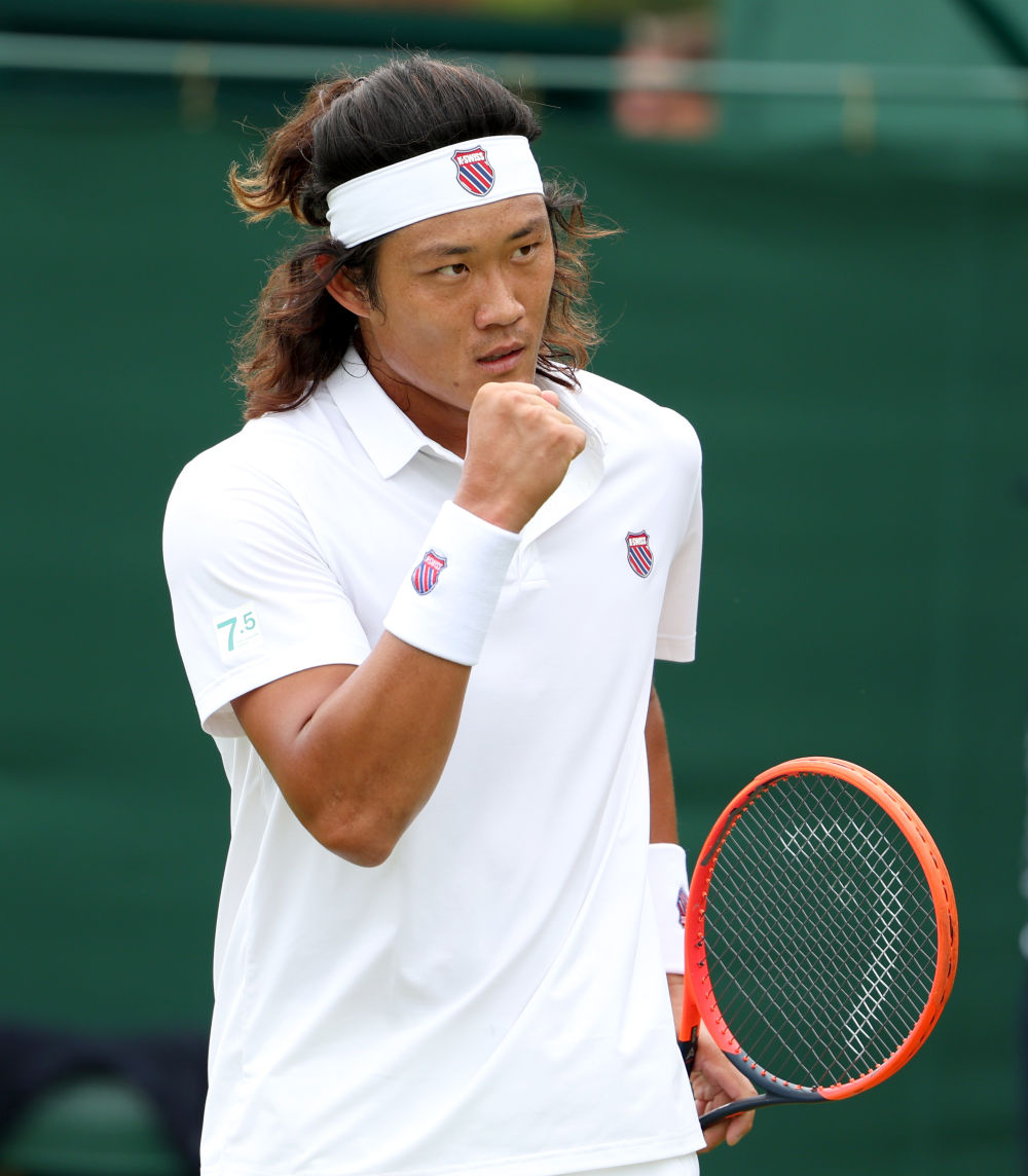 2024年7月1日,張之臻在比賽中慶祝得分。當日,在英國倫敦舉行的2024溫布爾登網(wǎng)球公開賽男子單打首輪比賽中,中國選手張之臻3比0戰(zhàn)勝法國選手揚維爾,晉級下一輪。新華社記者 李穎 攝