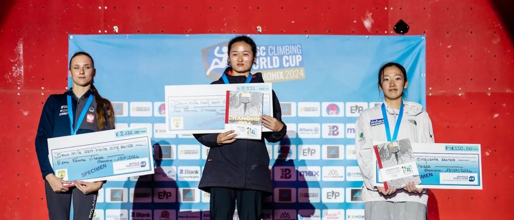 中國選手張少琴(中)在2024攀巖世界杯法國夏蒙尼站中獲得女子速度項目冠軍。圖源:國際攀聯(lián)官網