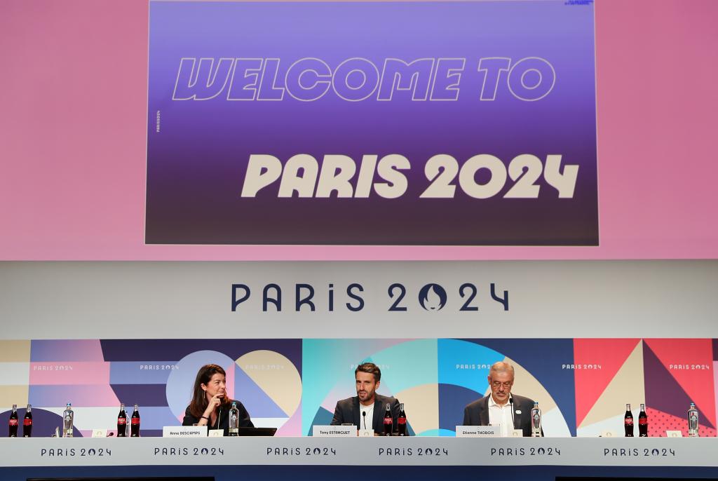 7月21日,巴黎奧組委主席托尼·埃斯坦蓋(中)在發(fā)布會上發(fā)言。新華社記者 王東震 攝