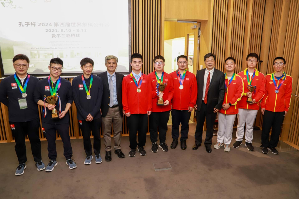 男子團(tuán)體前三名:中國隊(中)、中國香港隊(左一至左三)、中國上海棋院隊