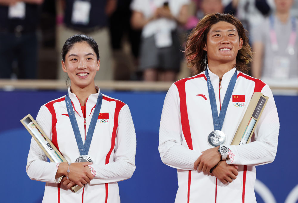 8月2日,巴黎奧運(yùn)會(huì)中國(guó)組合王欣瑜(左)/張之臻獲得網(wǎng)球項(xiàng)目混雙亞軍。新華社記者 高靜 攝