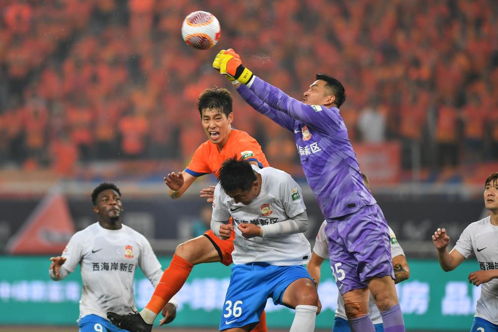 9月13日,青島西海岸隊(duì)守門(mén)員石笑天(右二)在比賽中防守。新華社記者 朱崢 攝