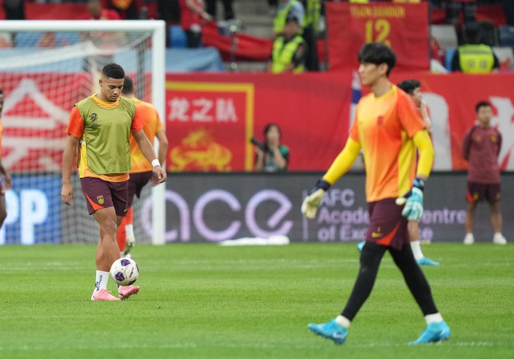 圖為9月10日,蔣光太(左)在2026年國際足聯(lián)世界杯亞洲區(qū)預(yù)選賽18強(qiáng)賽C組第二輪比賽前熱身。新華社記者 潘昱龍 攝