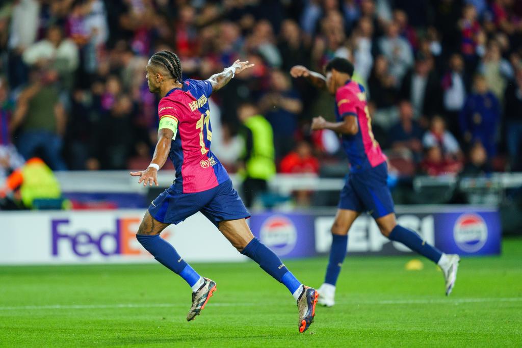 10月23日,巴塞羅那隊(duì)球員拉菲尼亞(前)在比賽中慶祝進(jìn)球。新華社發(fā)(胡安·戈薩 攝)