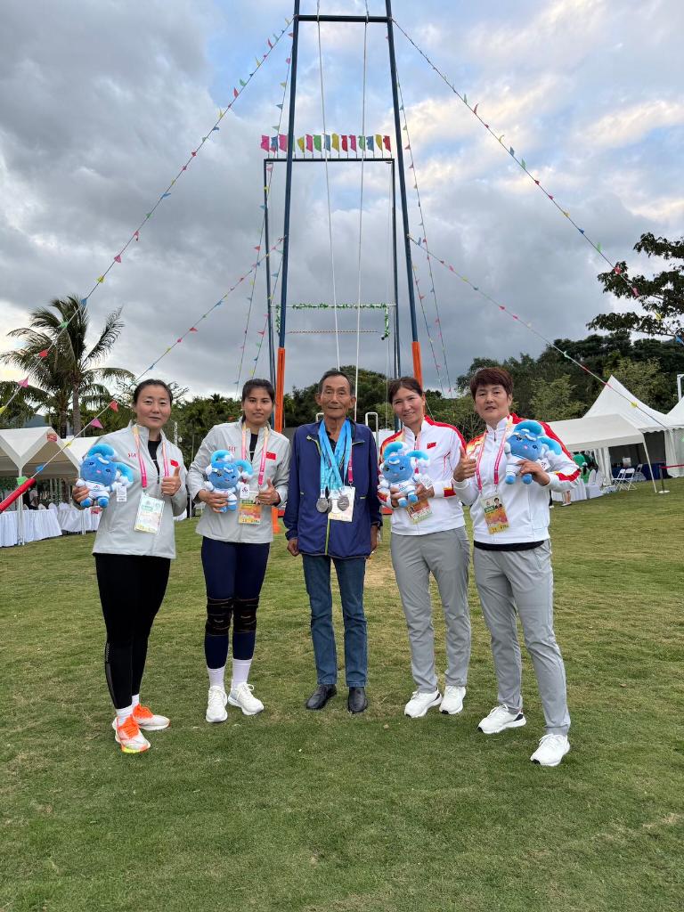 23日,新疆代表團(tuán)獲得本屆運(yùn)動(dòng)會(huì)秋千項(xiàng)目55kg雙人觸鈴比賽的三等獎(jiǎng)。頒獎(jiǎng)儀式后,師徒三人回到休息區(qū),收拾東西準(zhǔn)備離開。那一刻,天空由陰轉(zhuǎn)晴,陽光溫暖耀眼,掛在兩位新疆“古麗”身上的獎(jiǎng)牌,閃閃發(fā)光。