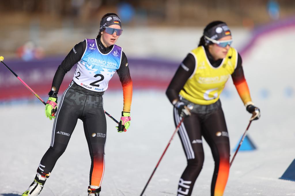 1月15日,德國選手約翰娜·雷克滕瓦爾德(左)和她的領(lǐng)滑員克里斯蒂安·克拉斯曼在2025年都靈大冬會(huì)越野滑雪女子10公里視障NS級(jí)比賽中。新華社記者 李京 攝