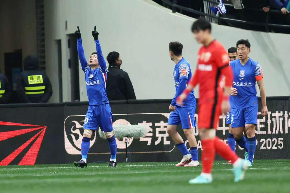 2月7日,上海申花隊球員于漢超(左)在進球后慶祝。圖片來自上海申花足球俱樂部官方微博
