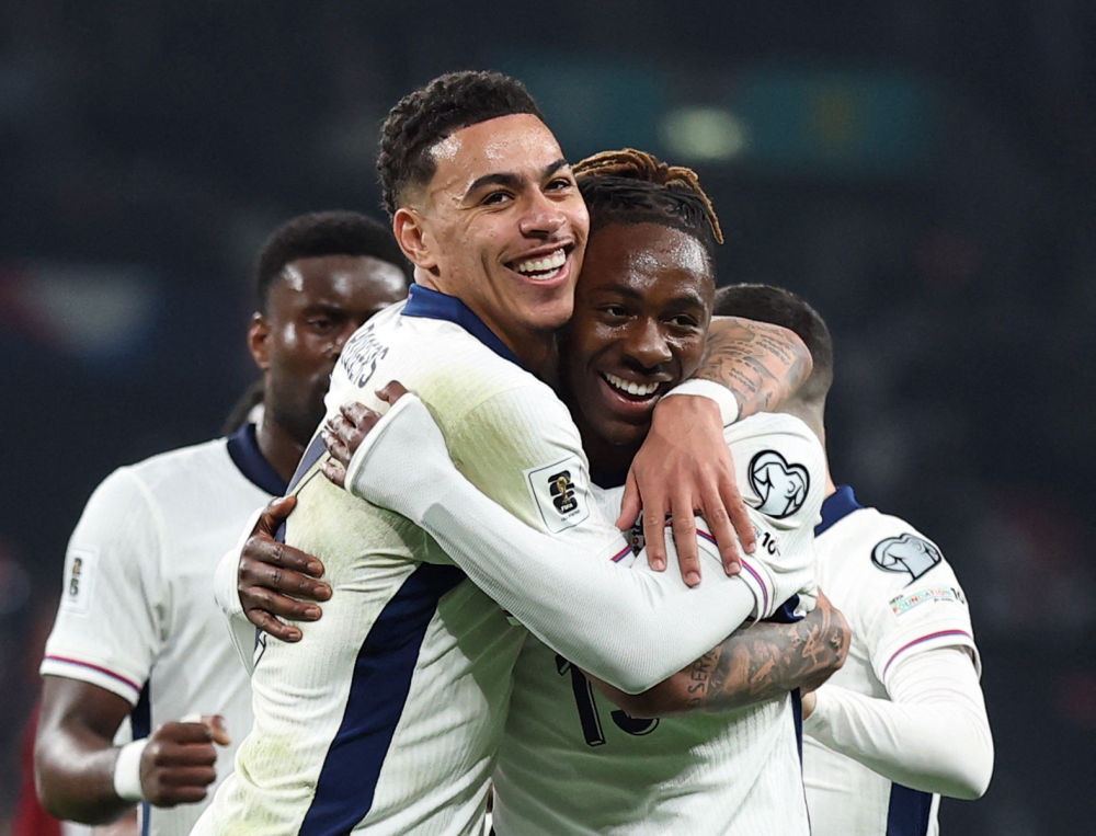 3月24日,英格蘭隊(duì)球員埃澤(前右)在進(jìn)球后和隊(duì)友羅杰斯慶祝。新華社/路透