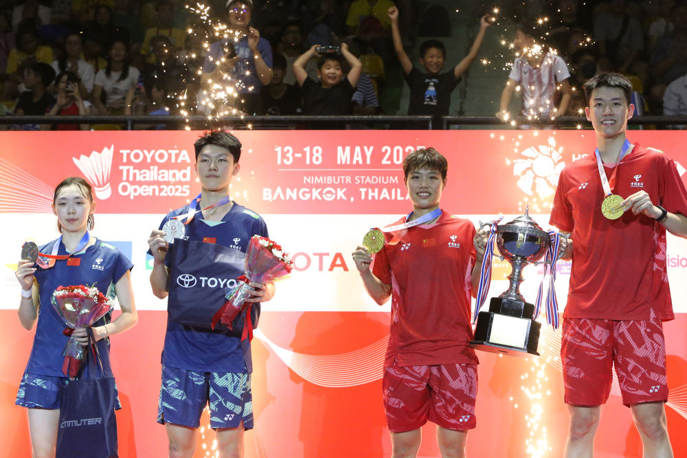 5月18日,冠軍馮彥哲(右一)/黃東萍(右二)和亞軍高家炫(左二)/吳夢(mèng)瑩在頒獎(jiǎng)儀式上。新華社發(fā)(拉亨 攝)