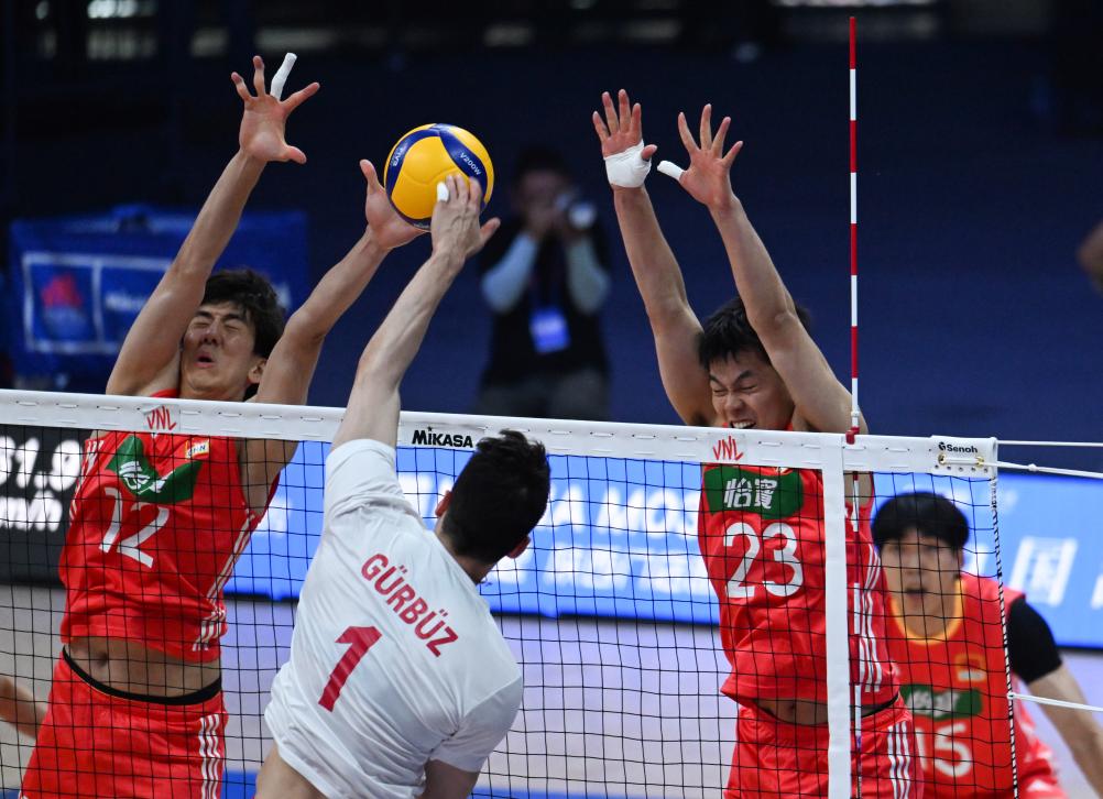 土耳其隊(duì)球員穆拉特·葉尼帕扎爾(左)、貝迪爾汗·比比爾在比賽中攔網(wǎng)。新華社記者 張博文 攝